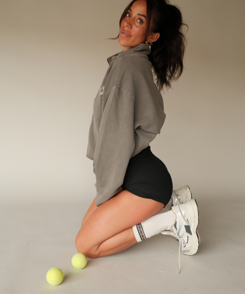 The Sunday Half Zip was made for layered chilly mornings, sideline strolls, and post-leg-day errands. With an oversized, preppy fit and mock neck zip, it’s that effortless, borrowed-from-him vibe, but make it cute. Finished with cream embroidery on the chest for that subtle flex.