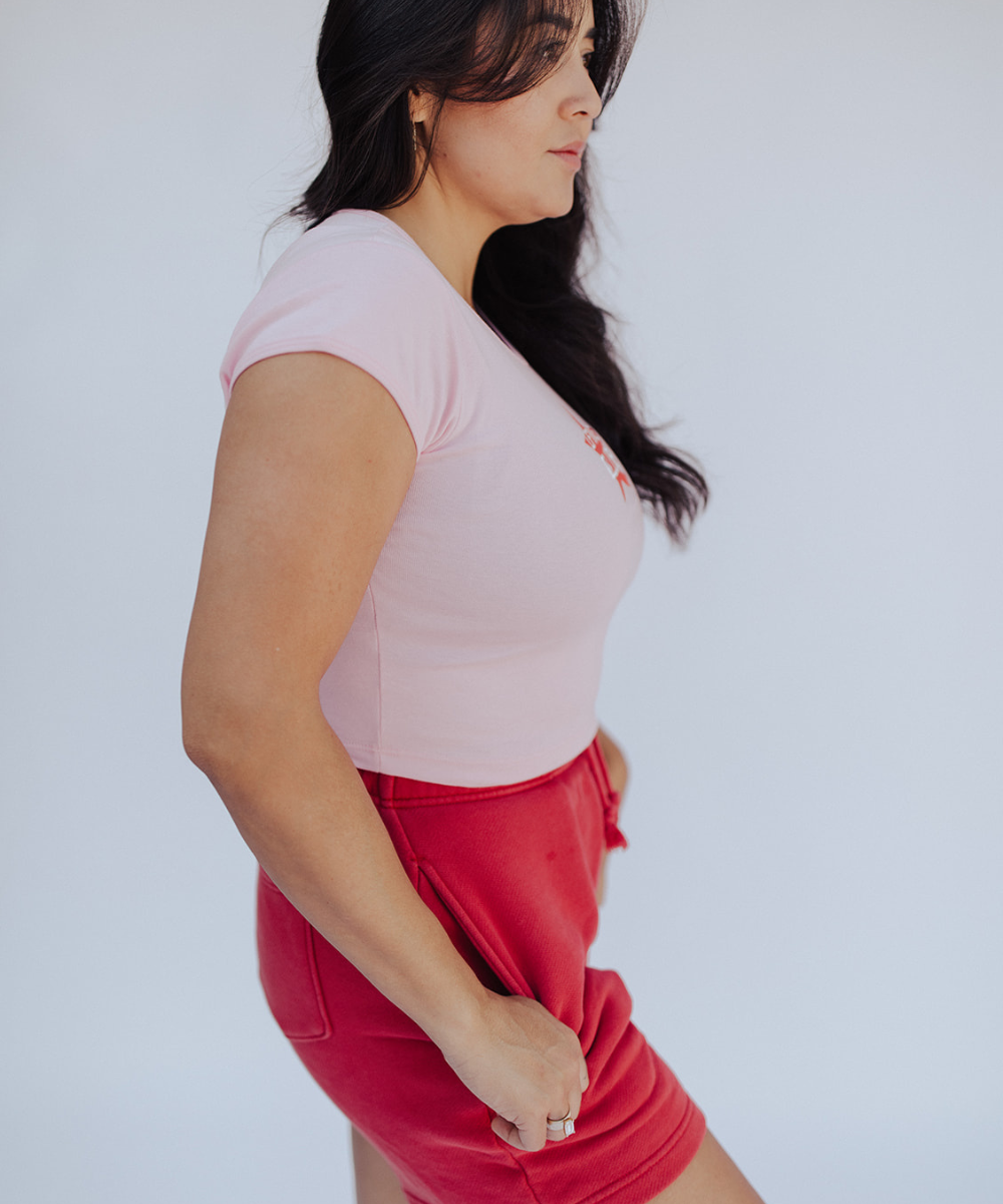 The barbell barbie tee was made for gym days, girly errands, and everything in between. This soft-stretch baby tee hugs in all the right places with a flattering, cropped fit that pairs perfectly with leggings, denim, or a fresh pump. Designed to feel good before and after wash, she’s the ultimate soft pink staple for strong girls who lift and lounge.